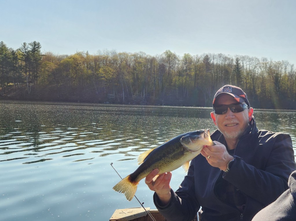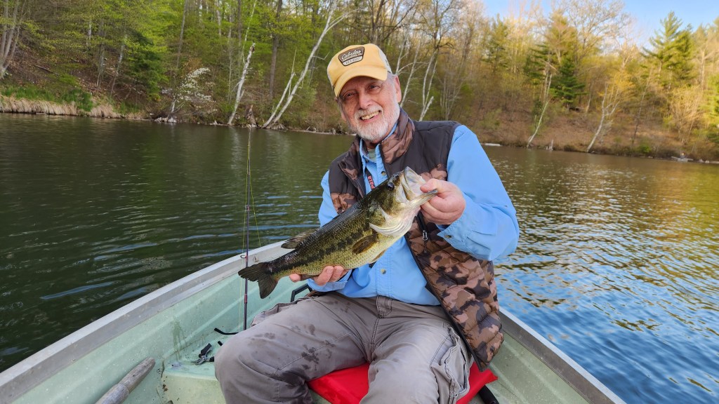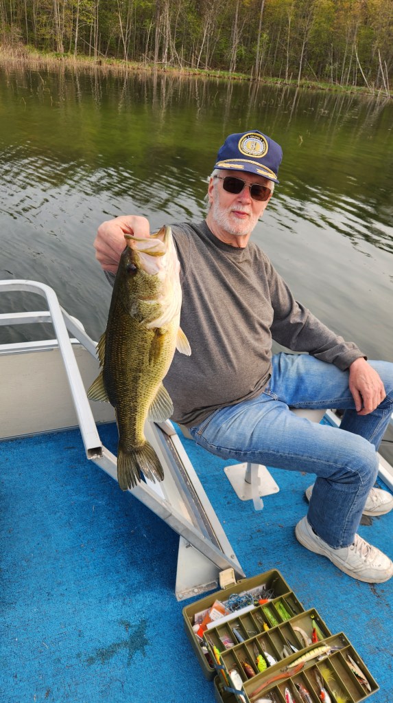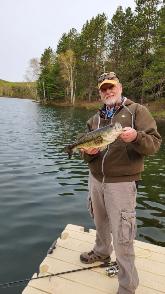 Larry W. and his wife Mary Jane were so kind as to invite me and Larry D. up to their family’s cabin in the pines. On the private lake the fishing was excellent as the large mouth bass were hitting well almost every day. We were joined by a bald eagle who observed us closely and snatched up bluegills we tossed to him. That was the icing on the cake! For the eagle video, go to: